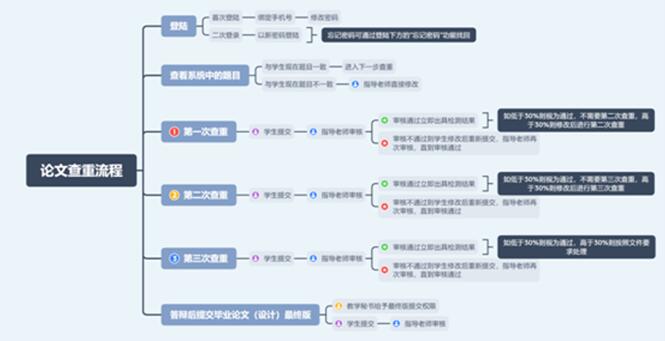 指导教师在“审核毕业论文(设计)”进行线上指导审核,学生一般有3次检测机会,如果3次检测还未通过,必须由指导教师再次指导修改后向教学秘书申请超权限再检测。论文审核和论文抄袭检测流程如图: