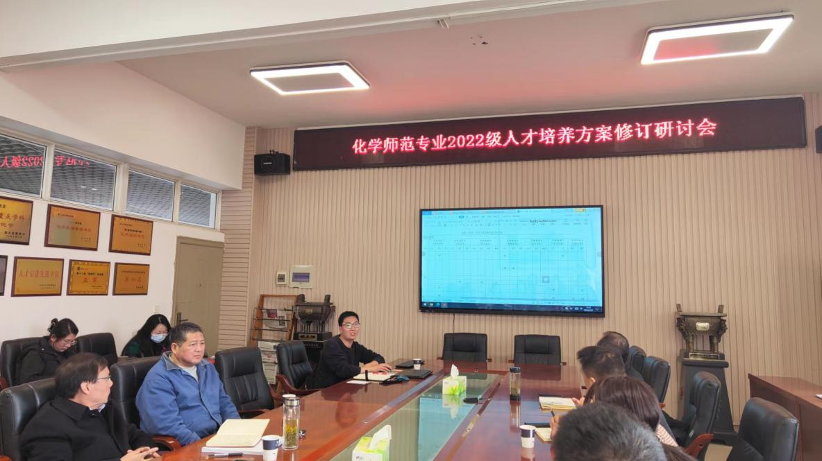 在14教西303会议室召开了化学师范专业2022级课程教学大纲及人才培养方案修订研讨会。会议由化学系主任舒文明老师主持,院长颜学敏、副院长吴爱斌以及各位骨干教师参加讨论。