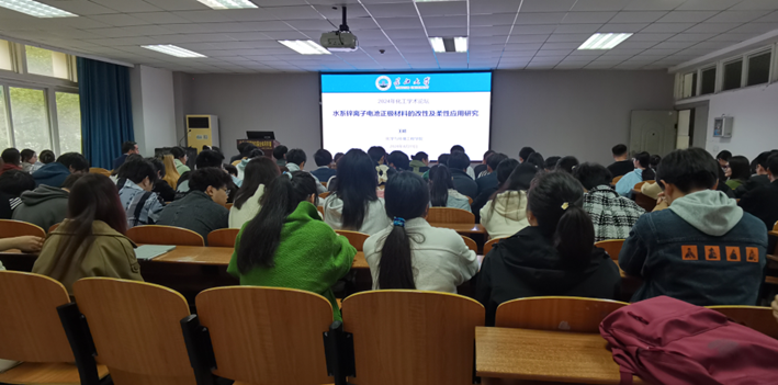讲座由主题讲解与师生问答两部分组成。开场时,赖璐副院长向大家简要介绍了主讲人王昭老师。王昭老师来自湖北麻城,是中共党员,2021年毕业于南开大学材料物理与化学专业并取得博士学位,随后在南开大学从事博士后研究至2024年2月,同年受聘长江大学“学科菁英人才(特任教授)”岗位,主要从事新能源材料与器件(水系电池、微电池、可拉伸电池、可穿戴柔性储能器件)以及相变储能材料的研究工作。