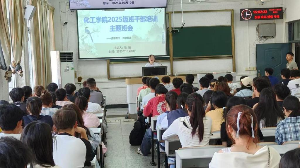 2025级辅导员徐茵主讲,兼职辅导员付涛、全体新生班干部参加。