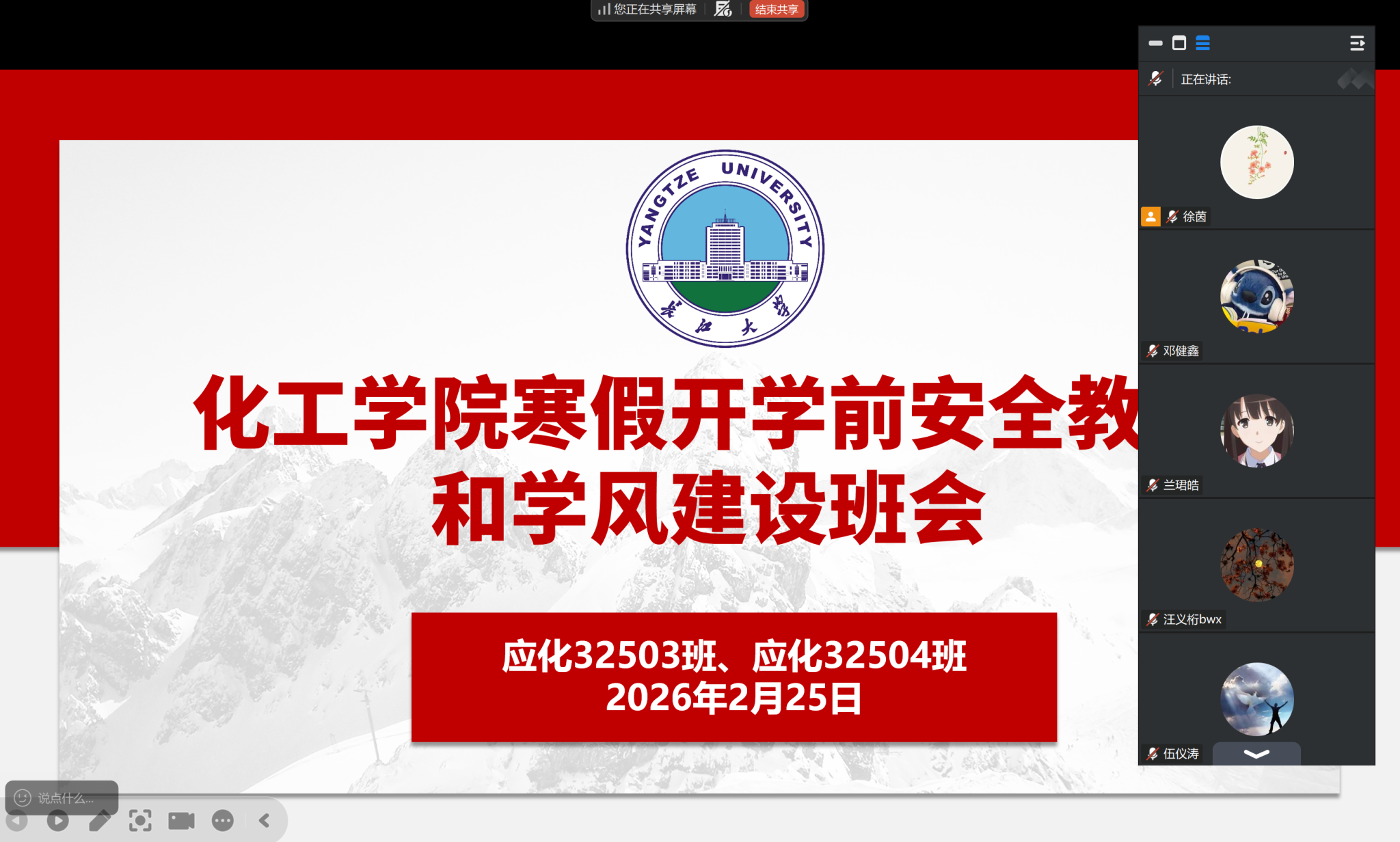 组织本科生、研究生各班级,通过线上会议形式陆续召开2026年春季学期开学主题班会。