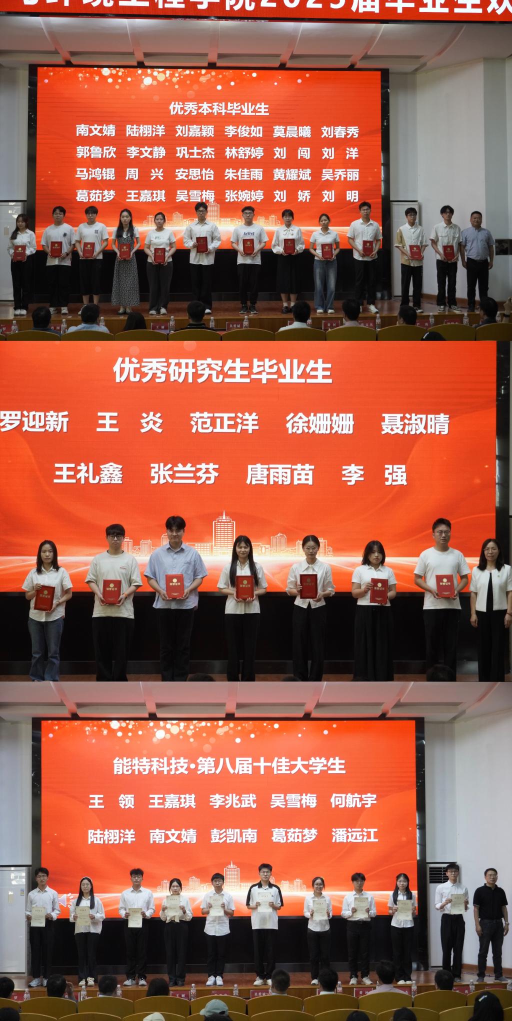 对在学业、科研、实践等领域表现优异的个人与集体进行了表彰。2025届毕业生以笔为刃、以梦为马,共有136名本科生、8名研究生成功考入清华大学、南京大学等高等学府继续深造读硕读博,吴雪梅等21位同学作为考研优秀个人上台领奖;高材12102、化工12101等6个班级以及23栋A404等3个寝室,以卓越的团队协作精神脱颖而出,荣获考研先进班集体和考研优秀寝室荣誉称号;邓智豪、焦珂宣等19位学生,代表2025届57名优秀毕业生上台领奖,他们在校期间努力学习,全面发展,以青春之笔,书写了拼搏奋进的壮丽篇章;最后压轴登台的是荣获Bet网站