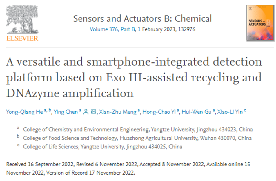 陈颖教授课题组在食源性致病菌的检测方面取得重要研究进展,相关研究成果以题为“A versatile and smartphone-integrated detection platform based on ExoIII-assisted recycling and DNAzyme amplification”的学术论文发表于分析化学领域国际著名期刊《Sensors and Actuators B: Chemical》(IF=9.221,中科院一区Top期刊)上。长江大学Bet网站