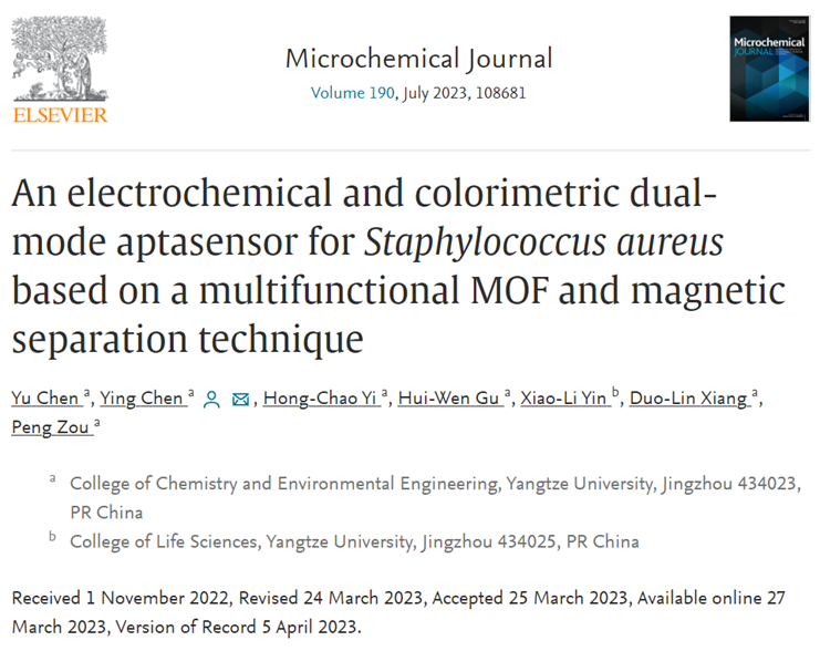 近日,陈颖教授课题组设计合成了一种兼具生物识别、电化学和催化功能的智能核酸功能化金属有机框架复合纳米材料,并将其应用于金黄色葡萄球菌的传感检测研究中。相关研究成果于2023年3月27日以题为“An electrochemical and colorimetric dual-mode aptasensor for Staphylococcus aureus based on a multifunctional MOF and magnetic separation technique”的学术论文发表在分析化学领域国际期刊《Microchemical Journal》上。该文第一作者为Bet网站