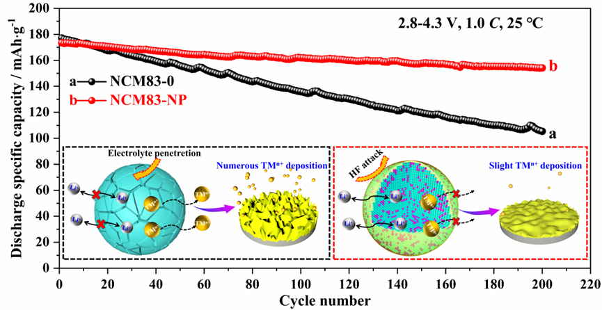 基于此,肖围教授课题组提出一种Nb5+掺杂与Li3PO4包覆的协同改性策略。以Nb2O5为Nb源,制得Li(Ni0.83Co0.11Mn0.06)0.99Nb0.01O2(NCM83-N)正极粉末后,通过溶胶凝胶法,用H3PO4溶液处理NCM83-N粉末,以得到Li3PO4包覆的NCM83-N(NCM83-NP)正极粉末。由NCM83-NP电极组装的电池展示出优异的循环稳定性和倍率性能,在1.0 C下能提供173.5 mAh g-1的初始放电比容量,循环200次后仍可保持88.8%的容量,即使在5.0 C下也能具有156.2 mAh g-1的高放电比容量,当电流密度恢复到0.1 C时,放电比容量依旧能恢复至190.6 mAh g-1。循环性能的提升主要是因为Nb5+的引入能形成强的Nb-O键以强化晶格框架,H3PO4处理能将材料表面的残余锂盐转化为有益的Li3PO4离子导体层以提升正极/电解质界面稳定性,从而抑制微裂纹的形成、过渡金属离子的溶出以及氧损失。倍率性能的提升则可以归因于拓宽的离子迁移通道、更紧密的颗粒堆积以及界面处快速Li+的扩散通道的构建。因此,该协同改性策略为高性能锂电池正极材料的设计提供了新思路。