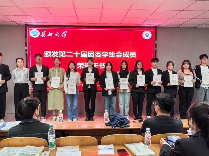 王陈老师和周学素老师为第二十届团委学生会成员颁发荣誉证书,兼职辅导员余海涛宣读第二十一届团委学生会全体成员任职名单。